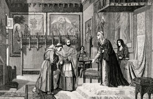 Historia del Reino de Castilla. «Presencia del Cardenal Cisneros (1436-1517) ante la reina Isabel I la Católica (1451-1504). Cuadro del señor Jadraque. Grabado por R. Milliet. «La Ilustración Española y Americana», año 1872.