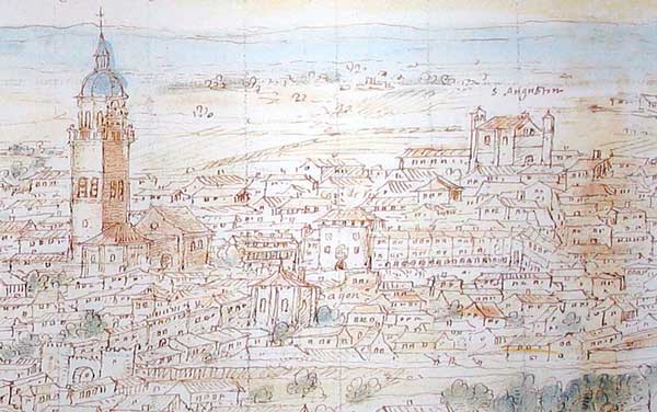 Vista de la plaza Mayor de Medina del Campo donde puede apreciarse el Palacio Real. Vista de Medina del Campo por Anton Van Den Wyngaerde de 1565. National Bibliotheck de Viena.