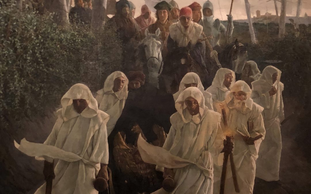 Tras la muerte de Isabel La Católica en el Palacio Real de Medina del Campo el 26 de noviembre de 1504, sus restos mortales emprenden un cortejo fúnebre camino de Granada. La reina había dictaminado que fuera la ciudad de Granada el lugar donde debía ser enterrada poniendo sólo una objeción a este dictamen: que el rey don Fernando deseara ser enterrado en otro emplazamiento, en cuyo caso ordenaba que sus restos descansaran junto a los de su esposo. El viaje a Granada estuvo repleto de dificultades, una travesía larguísima, pleno invierno, caminos embarrados, helados… y todo ello parece transmitir el óleo de Salvador Viniegra.