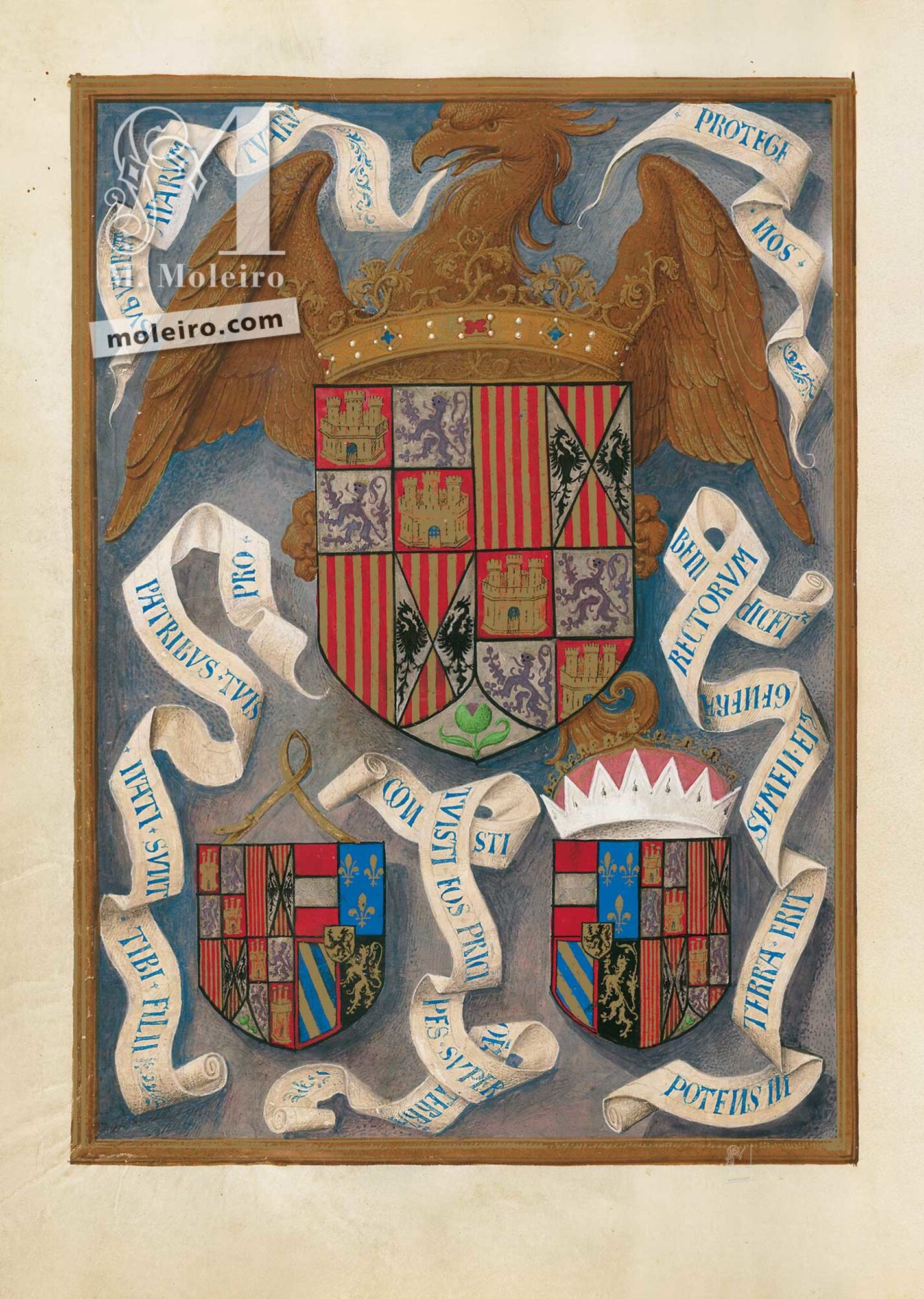 f. 436v, Escudo de los Reyes Católicos junto con los de sus dos hijos y yernos.
