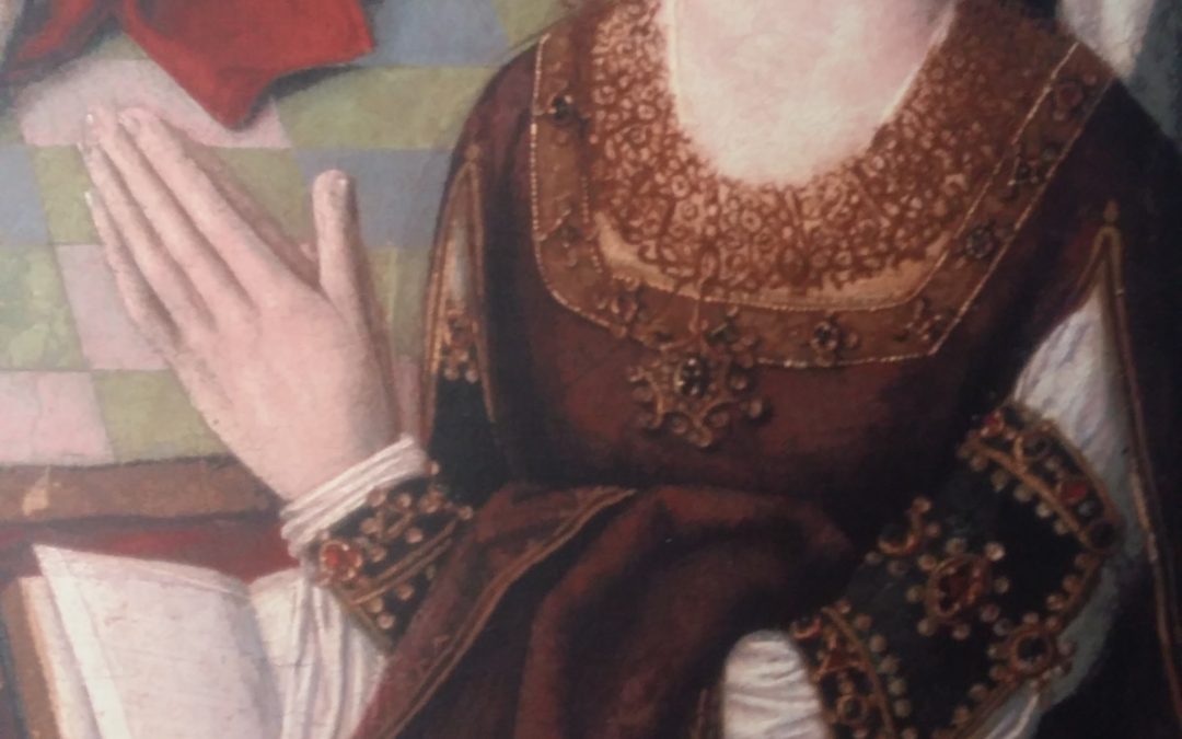 Detalle de la vestimenta con la que se representa a la reina Isabel I de Castilla en la pintura «La Virgen de los Reyes Católicos». Palacio Real Testamentario. Original en el Museo del Prado (Madrid). Juan de Flandes (1460-1519). Hoy nos toca rescatar del olvido otro...